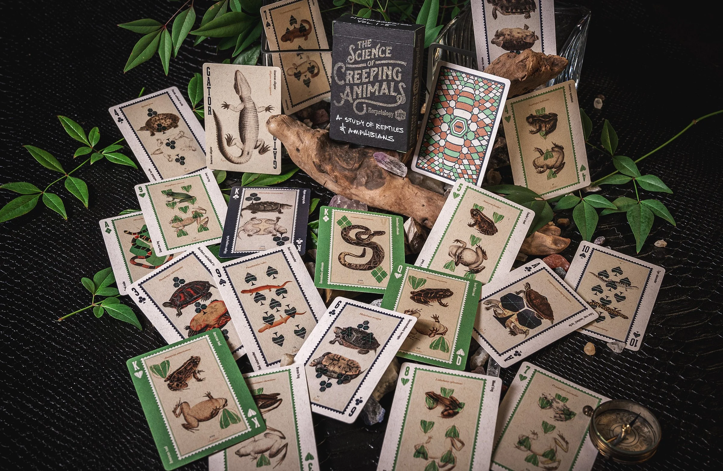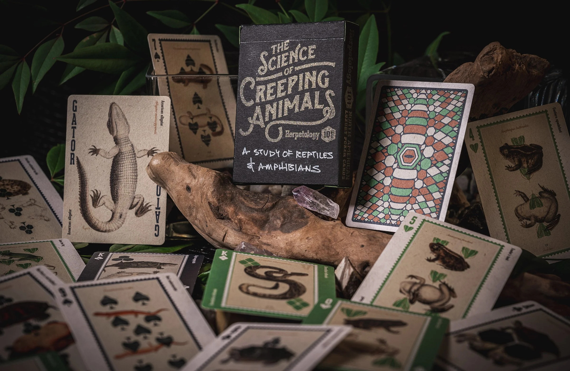 A lovingly curated poker deck of 54 vintage reptile and amphibian illustrations. Each suit features various snakes, frogs, turtles, and lizards found throughout the US as illustrated/cataloged by pioneering naturalist John Edwards Holbrook, M.D. circa 1842.