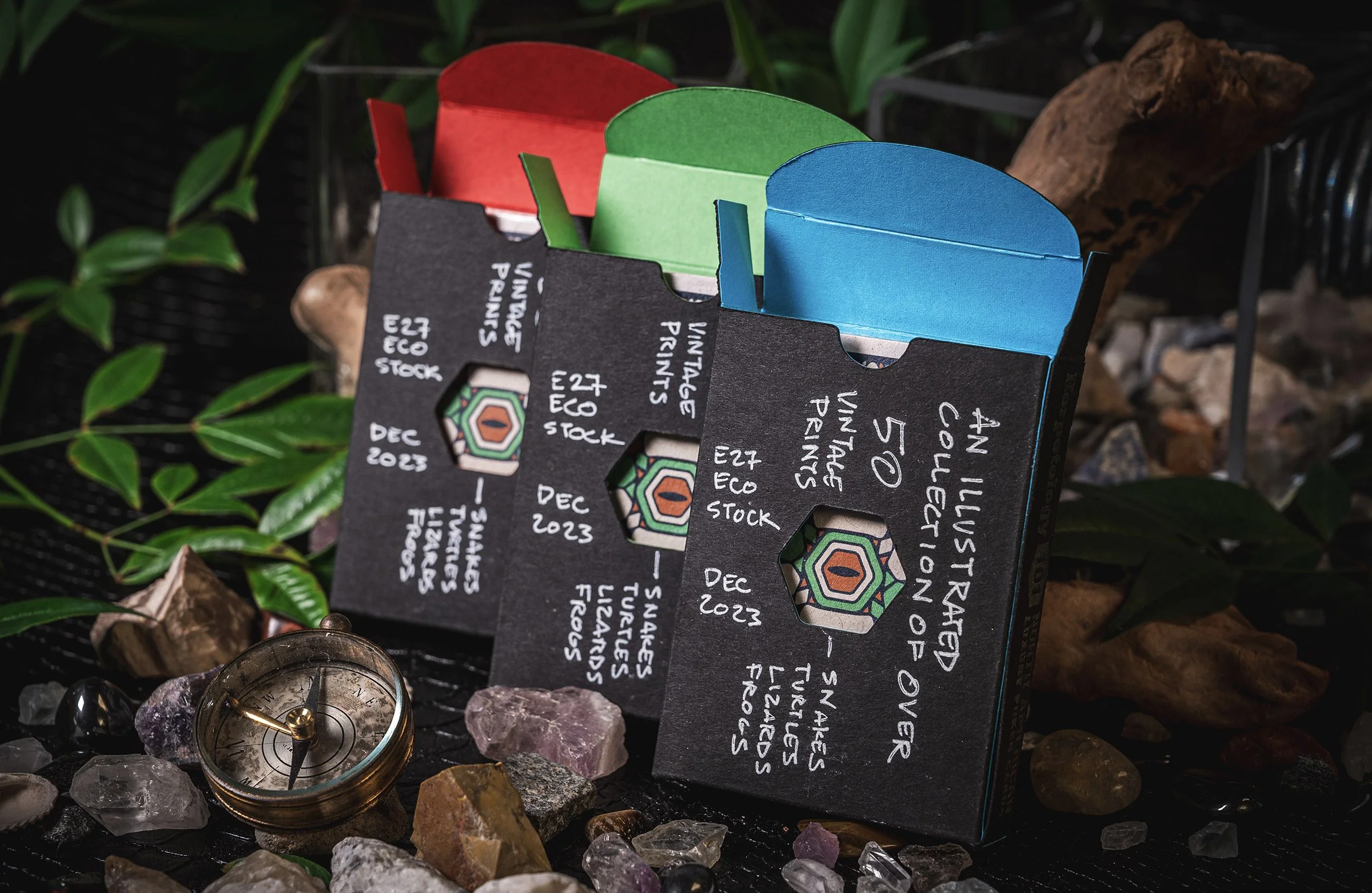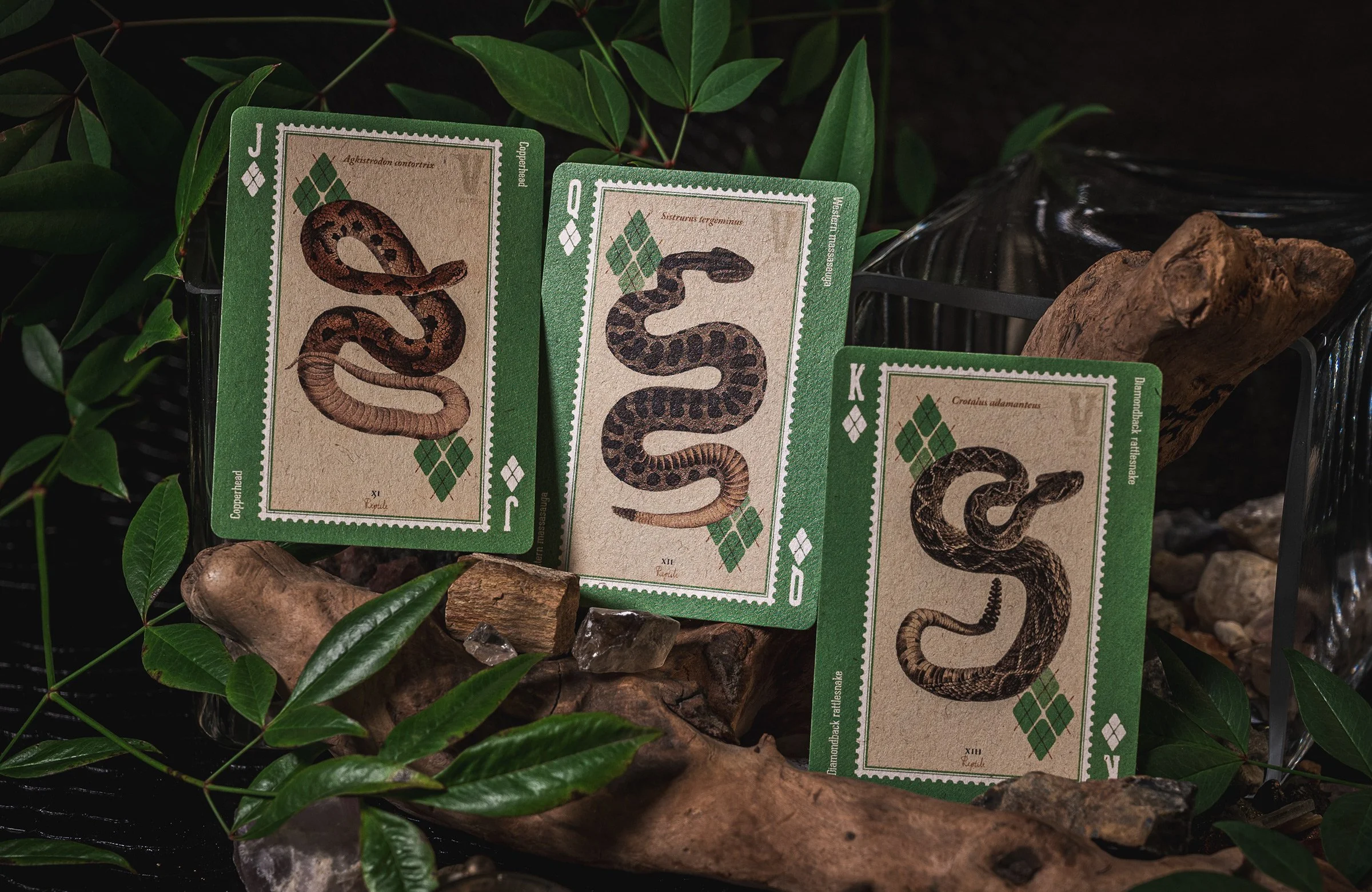 Herpetology 101 uses a unique E27 eco-herbage sustainable card stock with a smooth matte finish. The stock is a renewable resource made from herbaceous grasses and other leafy plants used for pasturage. The fibrous paper lends a beautiful natural color and a vintage, earthy feel to the deck—the perfect accompaniment for the subjects found within.