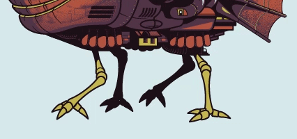 Using the ostrich motion study as a direct reference, both the foreground and background leg were keyframed & tweened to match. Slight variations in the travel distance of the background leg were taken into account to correct for the depth/thickness of the castle. There are 4 moving parts to each leg; upper & lower sections, and front & back toes. The finished loops look like this: