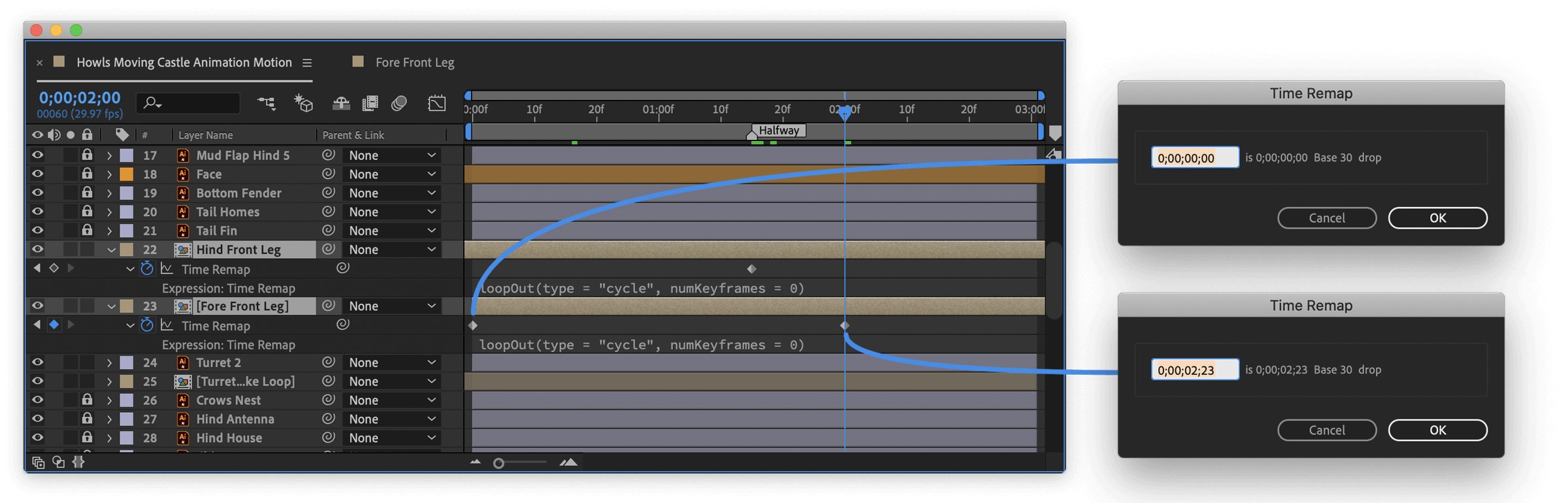 Each leg was Time Remapped with Layer > Time > Enable Time Remapping.