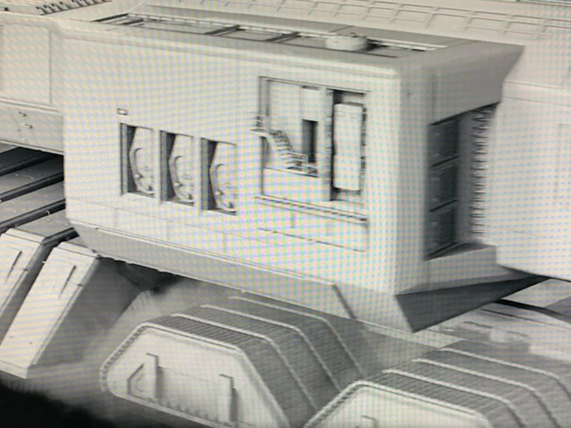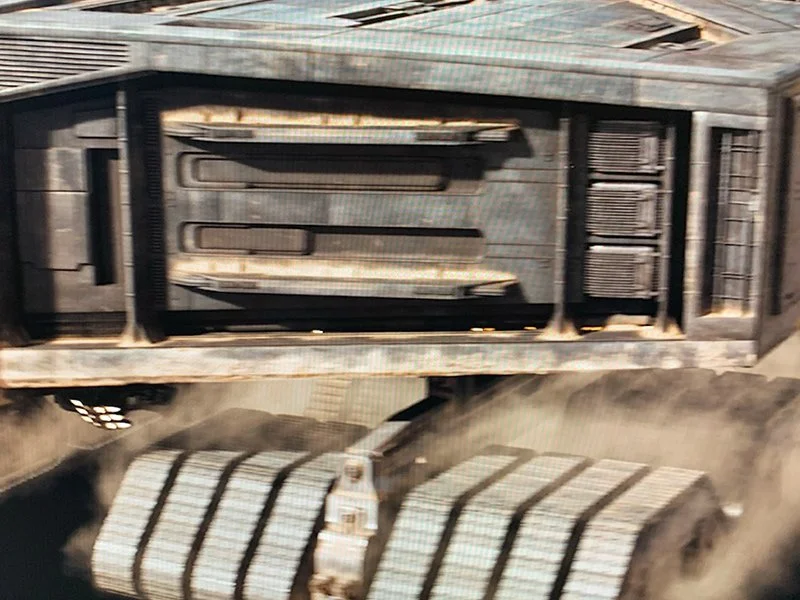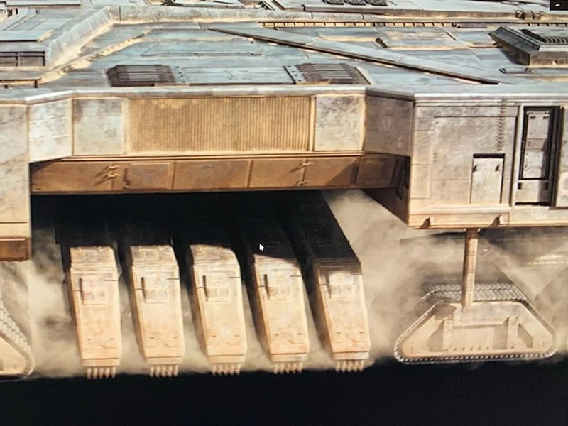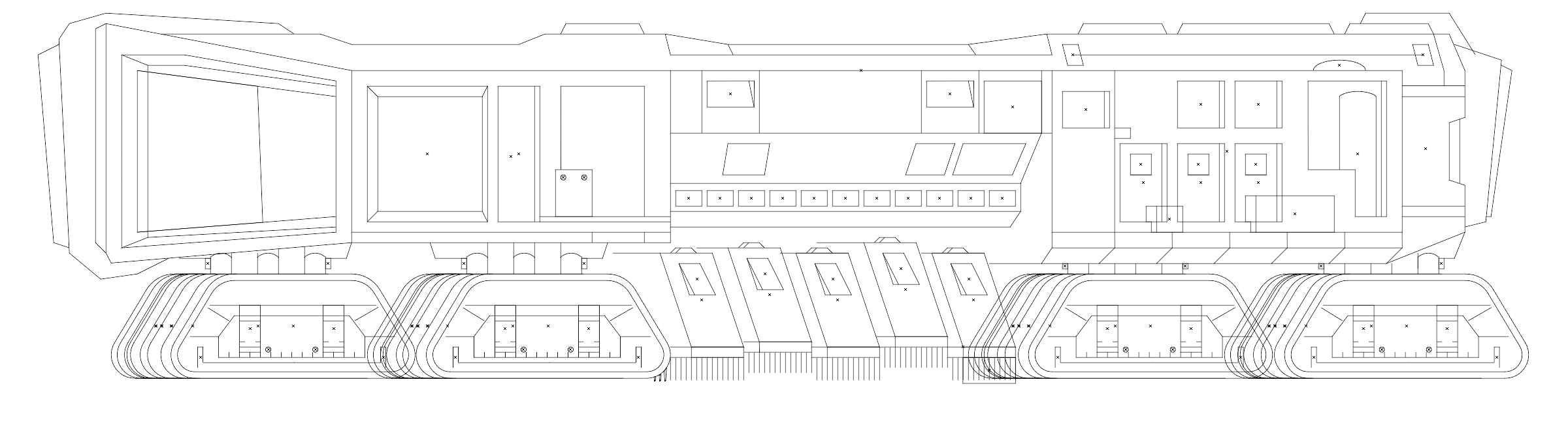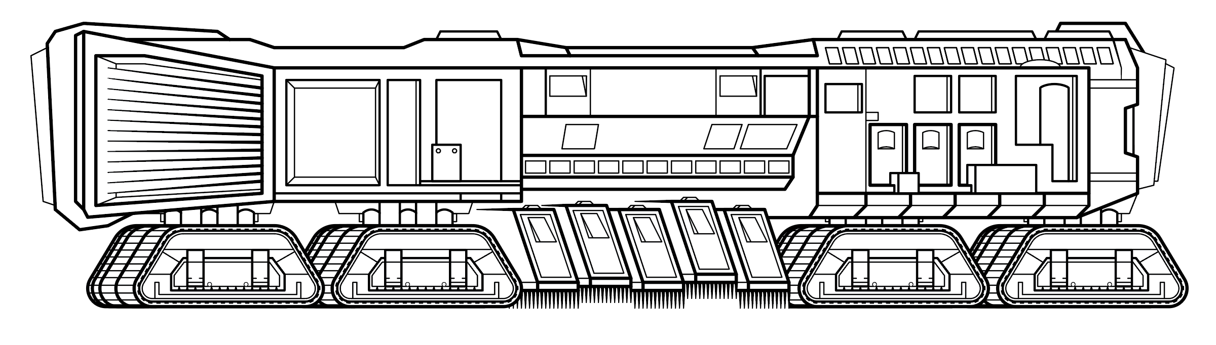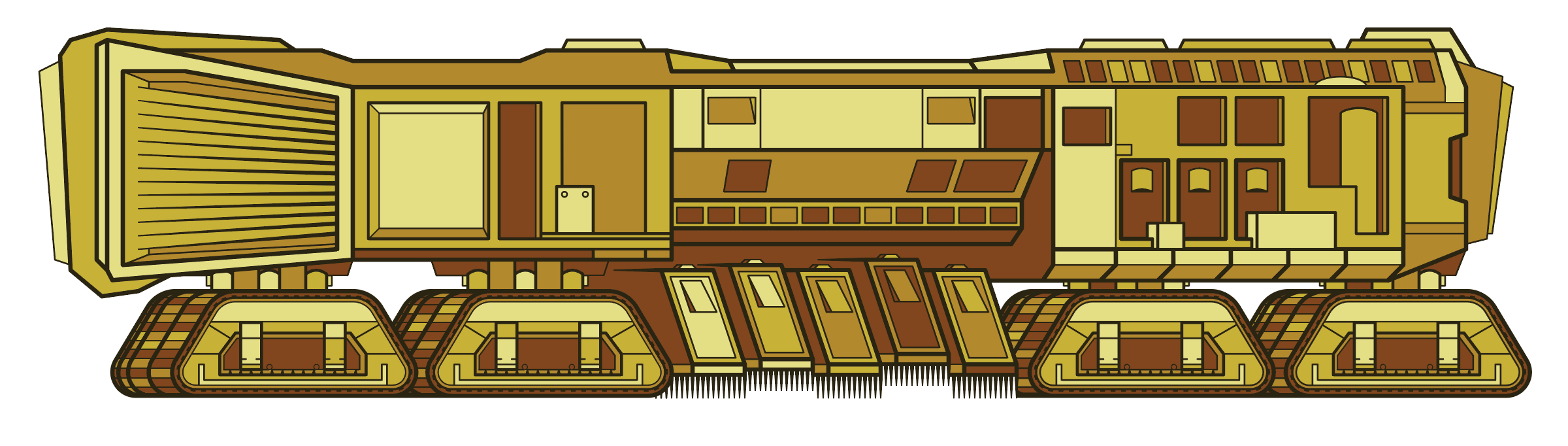Most of my work begins as simple line art. I stick with a few line weights and work out the general form, keeping in mind which shapes are major and minor elements. Here is the initial form before any color is applied. Notice how the front and rear of the spice harvester change over the course of the build; I found better reference materials from the movie’s special features and other behind-the-scenes shorts.