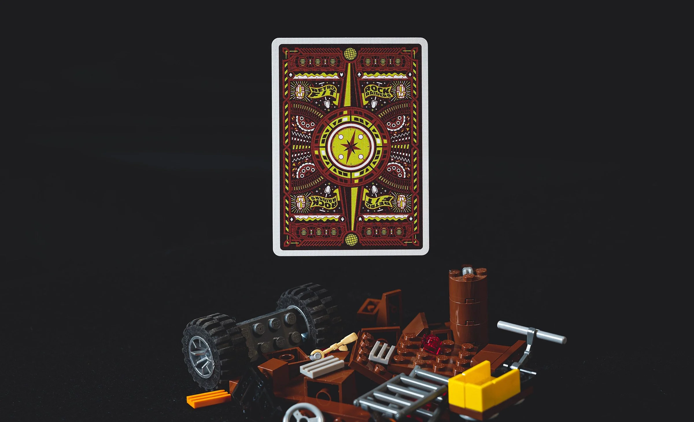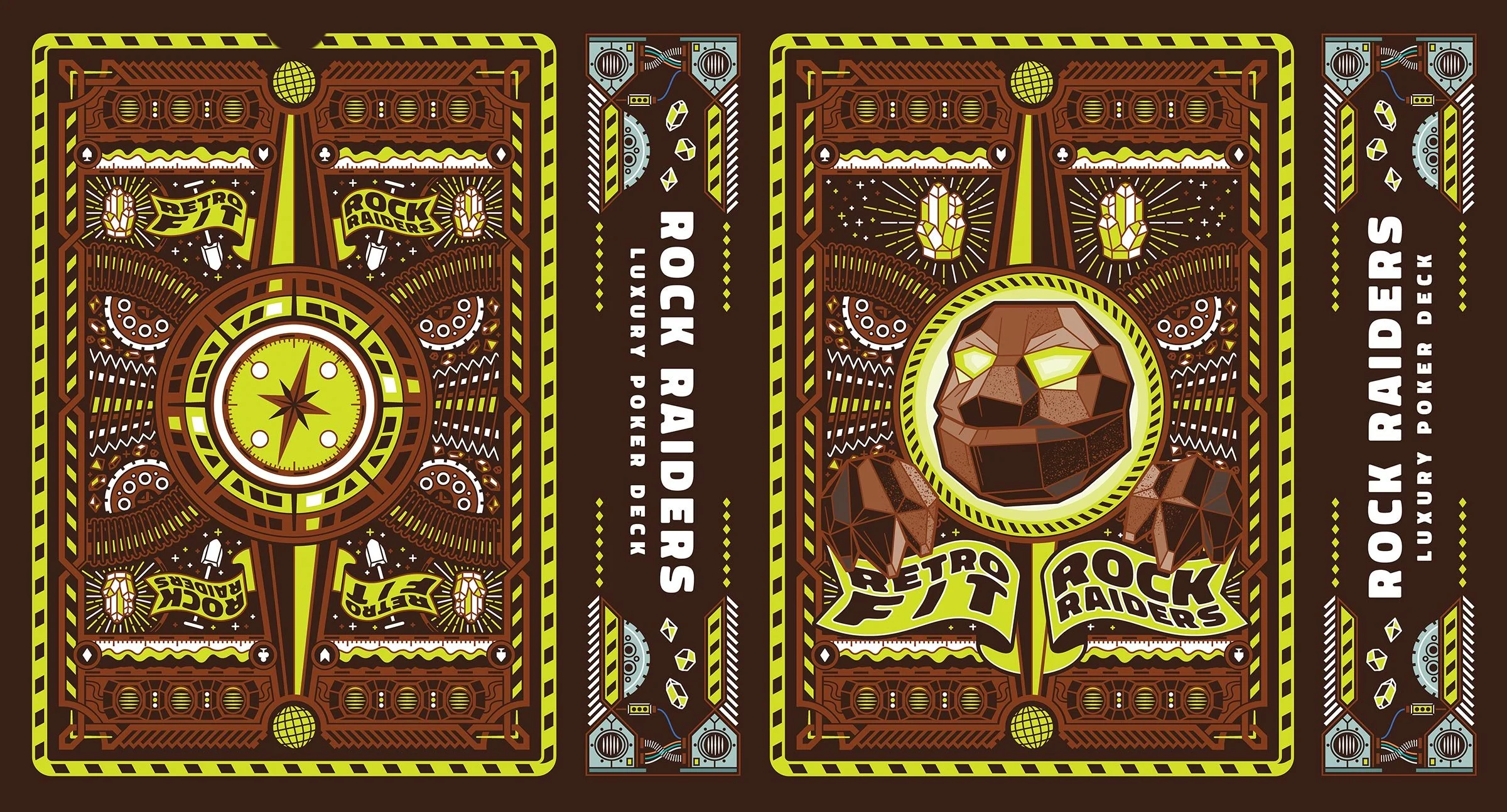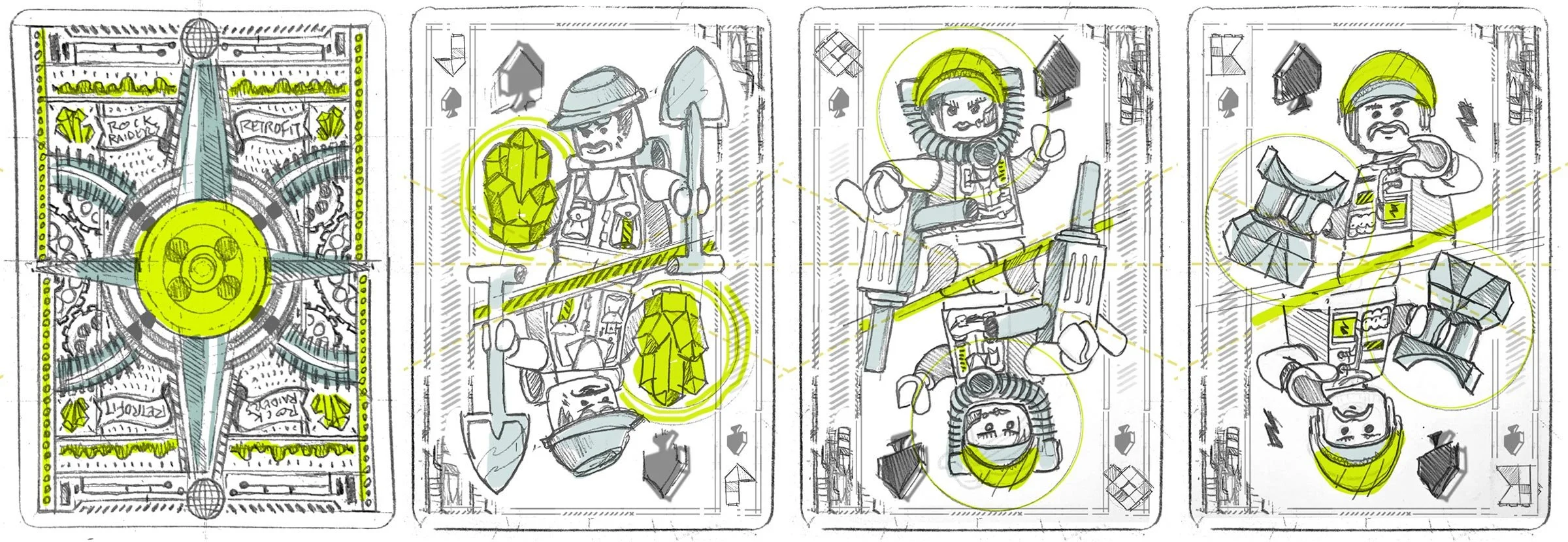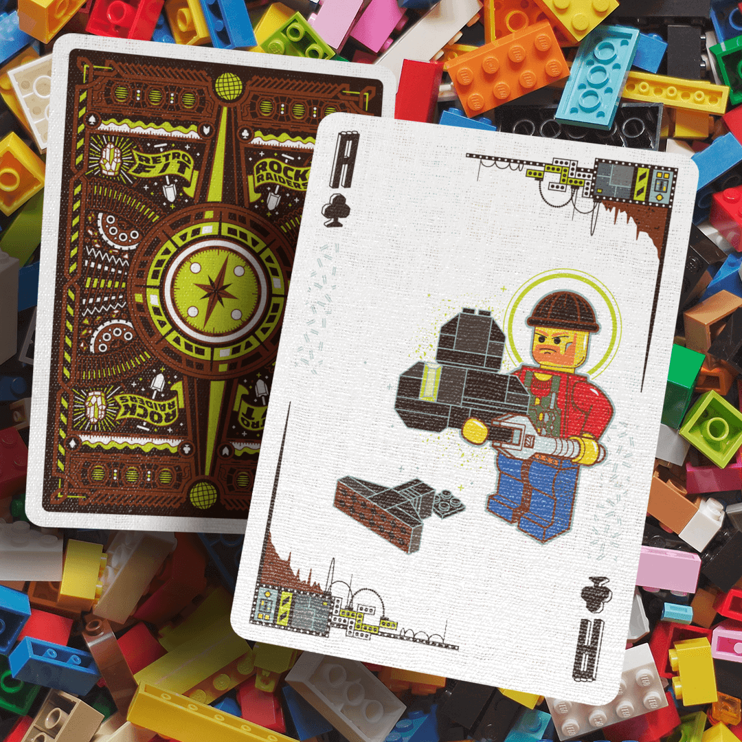 A private commission for a 1999 LEGO Rock Raiders-themed deck of playing cards. The story focuses on a group of miners stranded on a distant planet and their dangerous search for energy crystals. Every card features custom illustrations, characters, diagrams, pips, and typography.