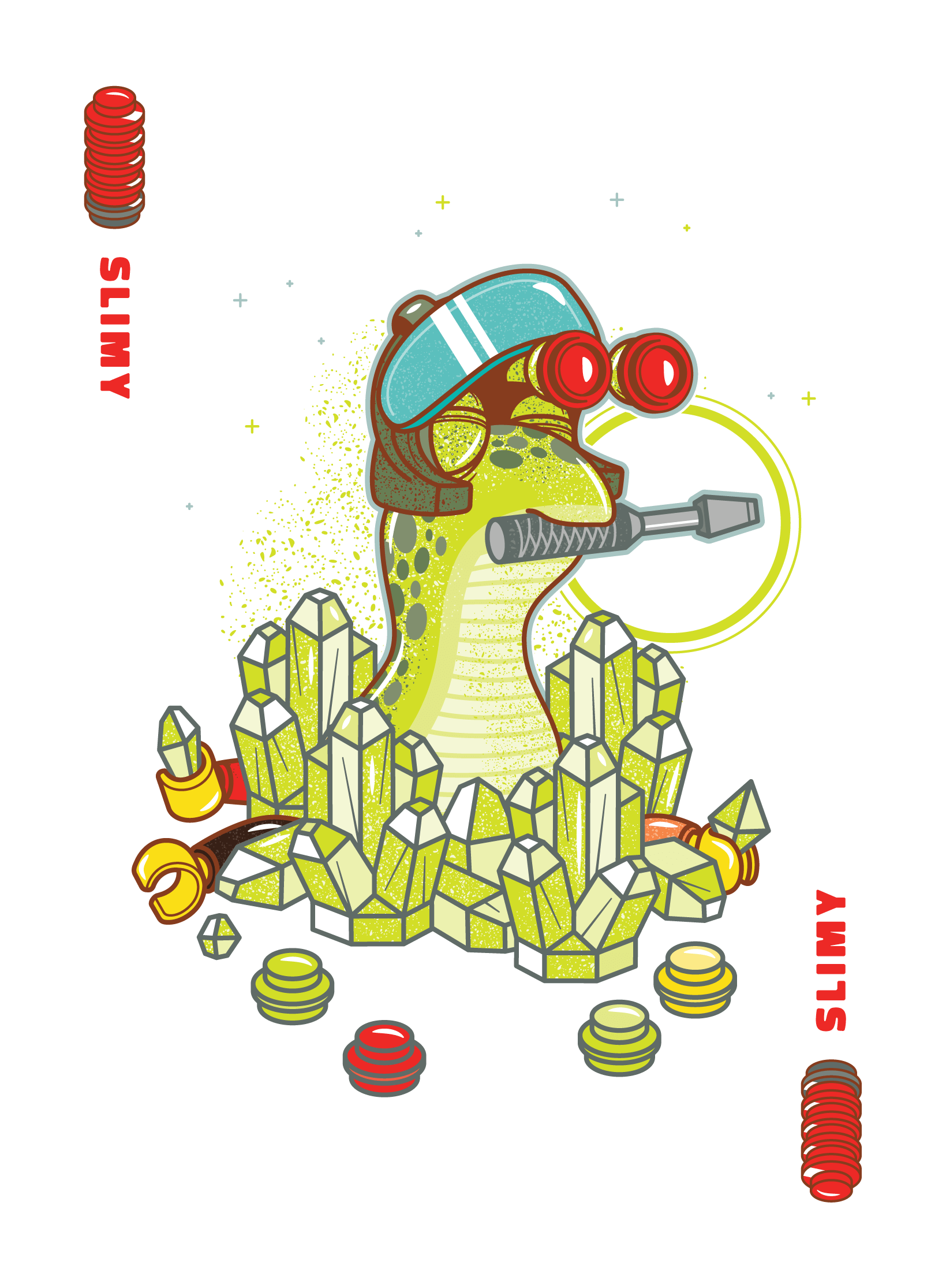 Each ace shows a large custom pip in various states of disrepair, with the spade highlighting the main protagonist—the Rock Monster. All cards with characters have a subtle illuminated manuscript vibe with the green energy crystal aura behind each figure’s head.