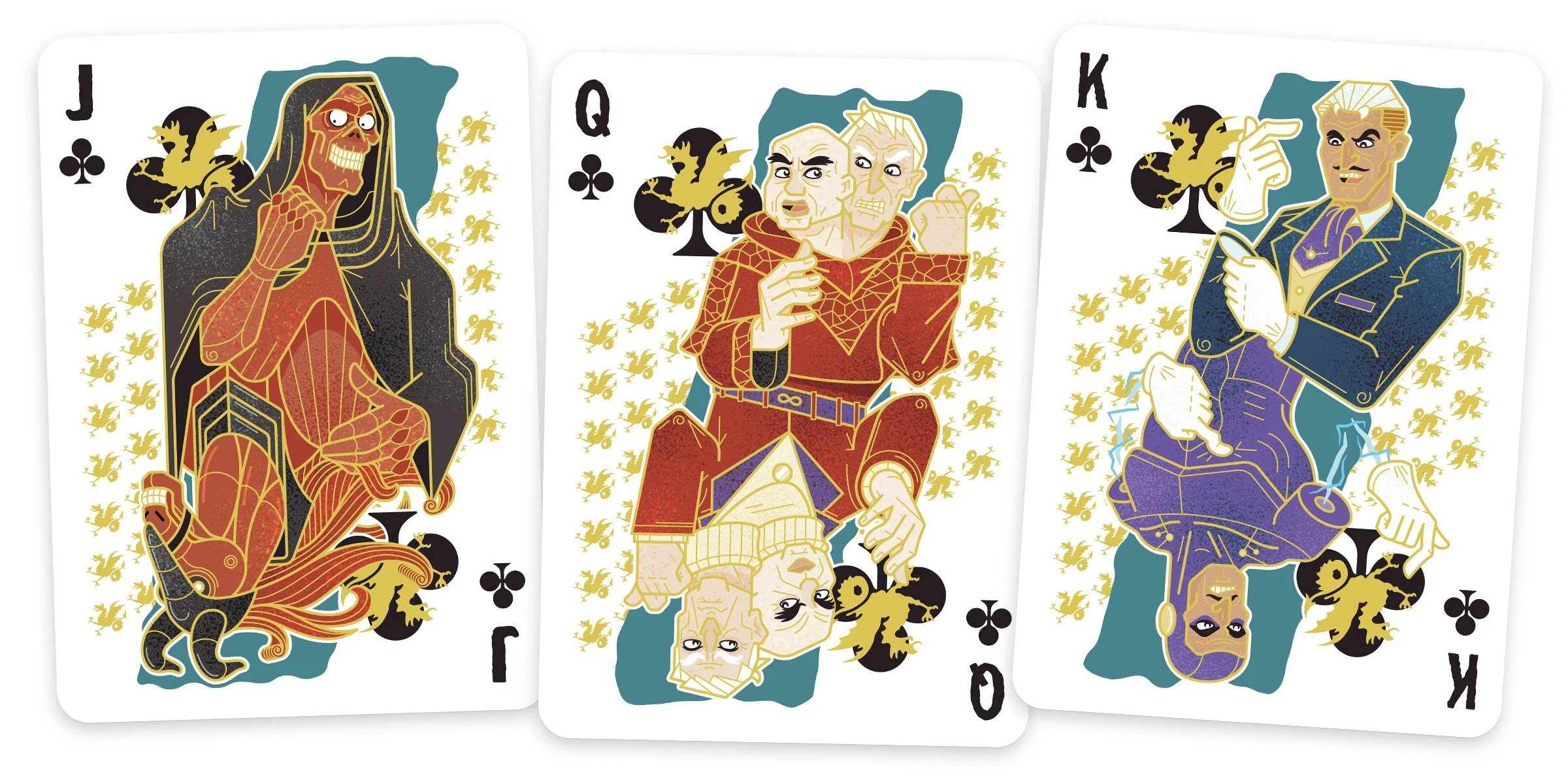 The characters all have alternate looks and costumes so the face cards use two different outfits for the top and bottom symmetry.