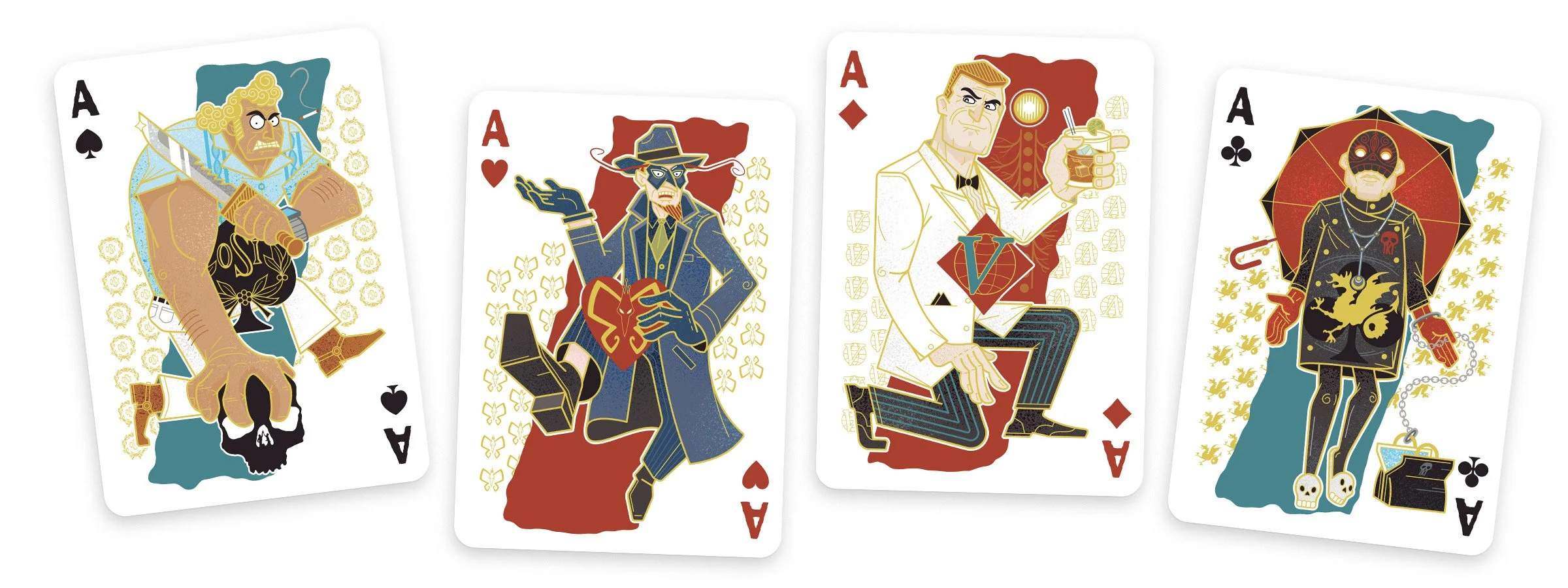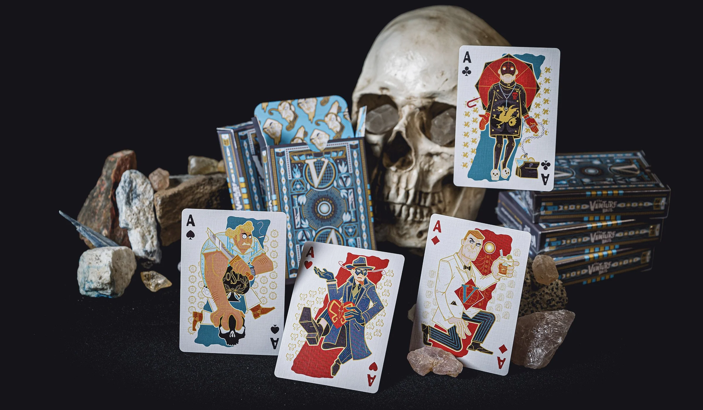 Since there’s a huge cast of characters in the Venture Brothers and every single card could have been illustrated, the list had to be narrowed down to about 20 favorites for budget and time. Illustrations are used on the court cards, aces, jokers, and a bonus gaff card. The rest of the number cards have custom pips and typography to match the theme.