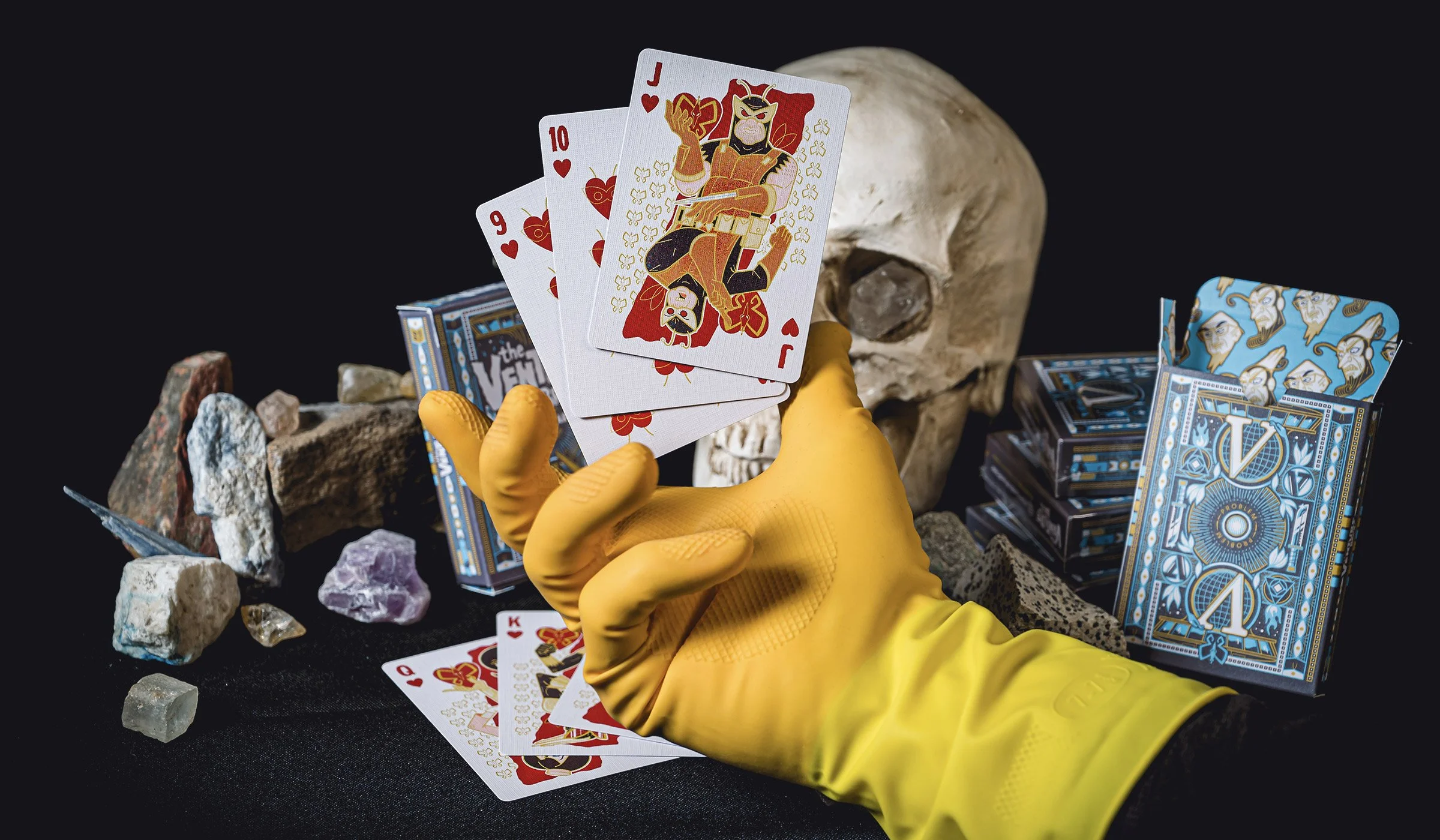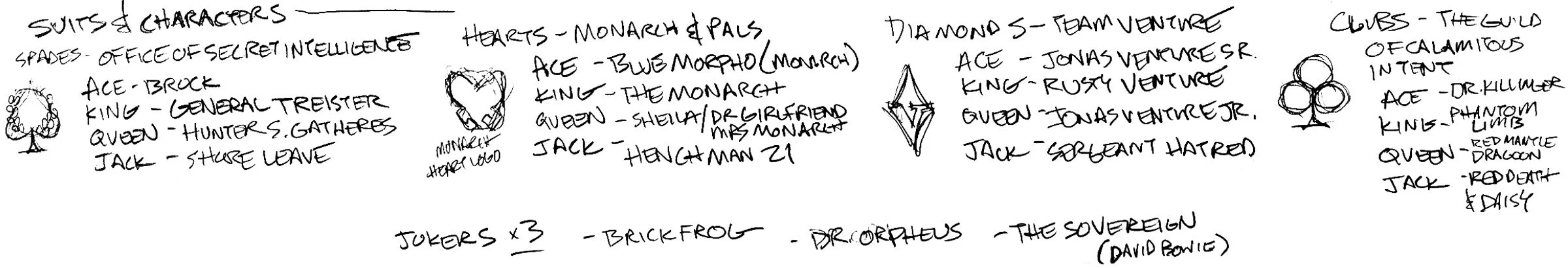 The original Team Venture jack of diamonds, Sgt. Hatred, was eventually changed to Rusty’s kids, Hank and Dean, after an initial round of feedback. Because there are so many characters, I have some ideas for future booster packs or replacement cards to swap in for those special poker nights on Gargantua-1 😉🃏.