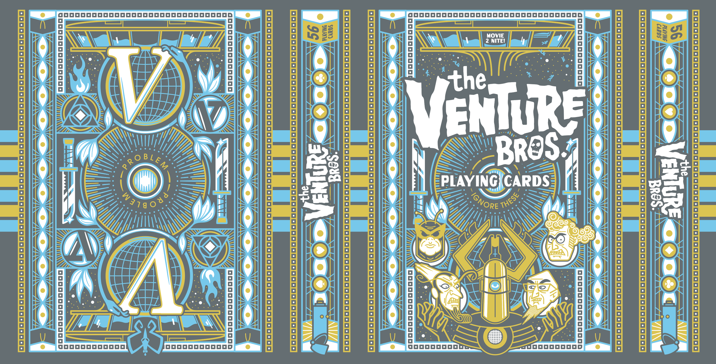A private commission for a Venture Brothers-themed deck of playing cards. This was one of my favorite shows from the old Adult Swim block on Cartoon Network. All custom illustrated characters, pips, typography, and a few other surprises. Go Team Venture!