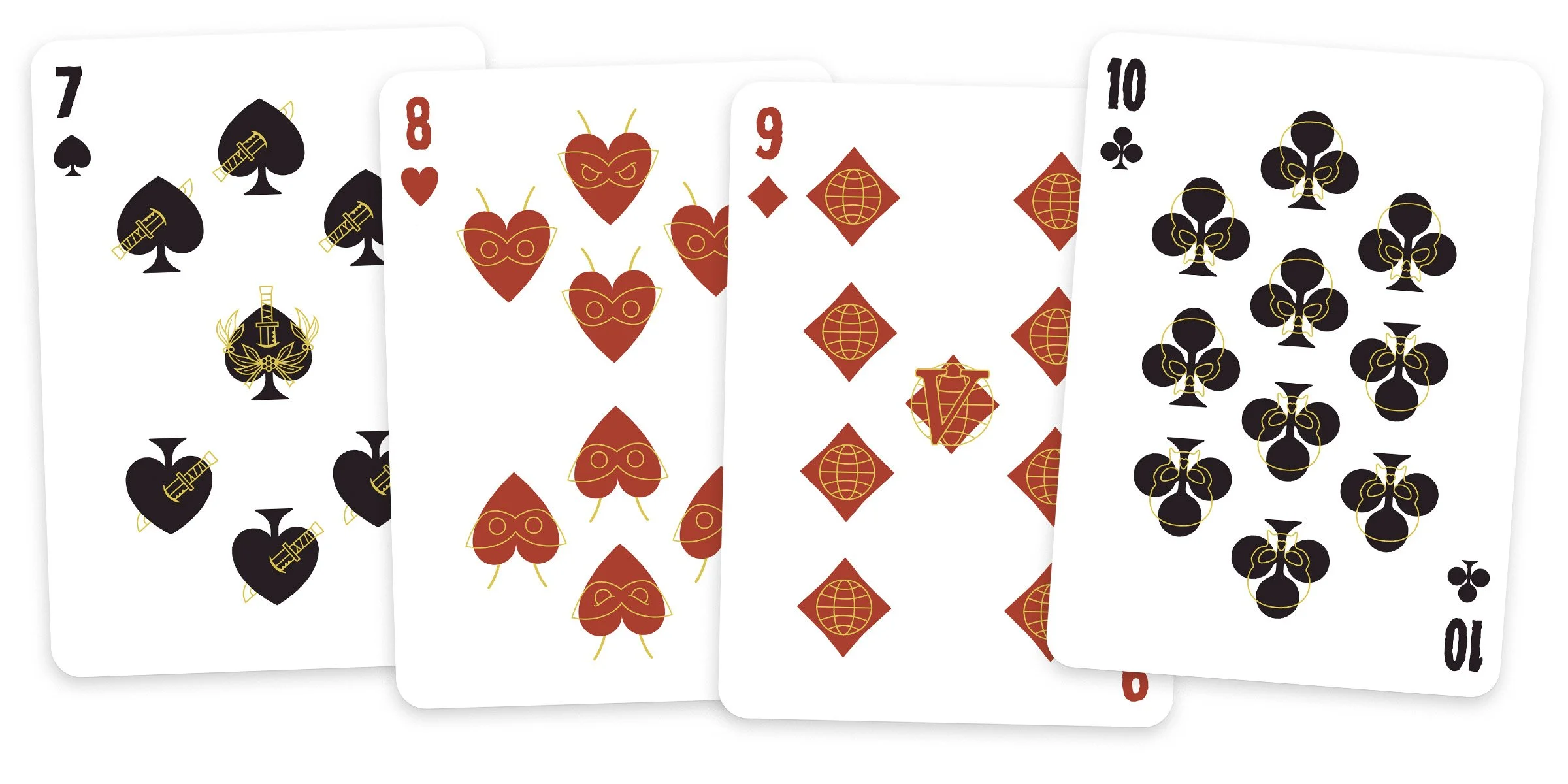 Pips were created using the iconography and logos of the various factions. Odd-numbered cards with a central pip have a slightly more detailed mark. Gold lines and strokes were used on nearly everything for future plans to print with foil.